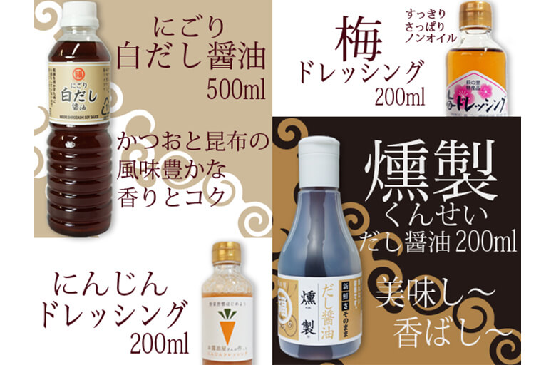 当店大人気商品の、だし醤油(かつお、いりこ、昆布、燻製、白だし)を販売いたします。また、とってもおいしい佃煮(しめじ、椎茸、山椒チリメン、キャラブキ)や、炊き込みご飯の素、ドレッシング、焼肉のたれ、漬物の素といろいろな商品を用意しております。是非、お越し下さい。
