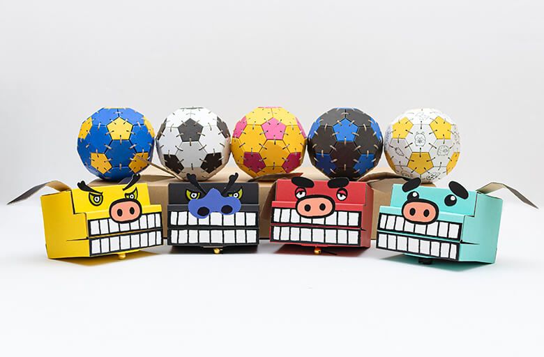 段ボール製の平面の五角形と六角形とビスを差込むことによって立体的なサッカーボールが出来上がります。立体パズルで簡単そうに見えて難しいかも?