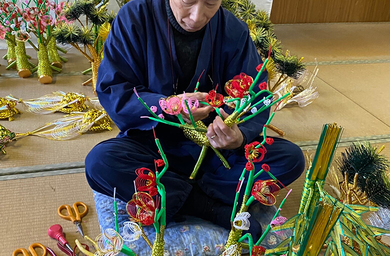 1975年設立後より、古くから受け継がれる日本の美しいしきたり「結納式」を結納飾りを通じて支えております。地元職人・内職者と共に全国各地への卸や地元への小売を行いながら、業界初の桂由美・山本寛斎ブランド結納や羽子板飾りの製作に携わって参りました。一方、ライフスタイルの変化とともに結納飾りの需要が低迷していく中、「水引」そのものを知らない方が増えてきていることに危機感を覚え、2代目が水引を身近に感じてもらえるアクセサリー作りにも取り組んでおります。長年水引工芸に携わってきた弊社だからこそできるアイテムづくり。水引の魅力を伝え、継いでいくものづくり。をテーマに匠の技、柔軟な発想、市場動向を踏まえた多数のアイテムをご用意致しております。一方通行の商品提供のみを行っていくつもりはございません。時代にあったより良い品をお客様にお届けするため、忌憚のない意見を交わしながら一緒に商品/売場づくりを行っていければ幸いです。小さくなるほど技術が求められる水引工芸の世界をご体感ください。