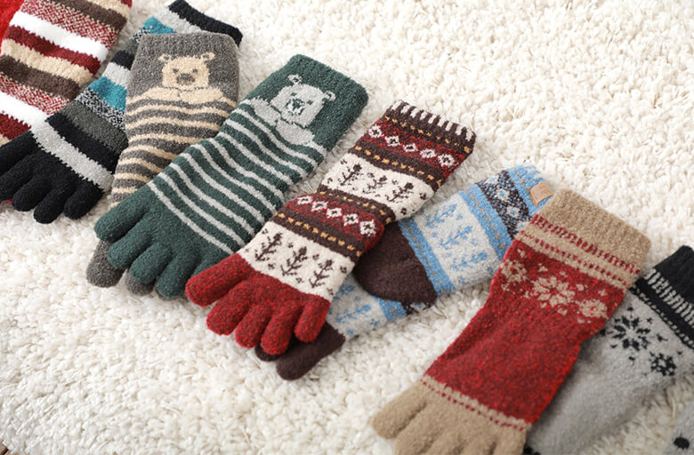 手を温めることを追求してきた“てぶくろ屋”だからこそできた靴下!手袋で培った技術あるからこそ実現した足全体にフィットする立体構造と指先に縫い目がないのでとても快適な着け心地です。靴下の中はチーゼルという植物の実を使った伝統的な起毛で、手作業で指先までひとつずつ丁寧に仕上げられたとても肌触りが柔らかく気持ちいい仕上がりになっています。素材は手袋に使用される非常に柔らかく伸縮性に富んだ糸で19㎝~25㎝と男女問わずご使用いただけます。