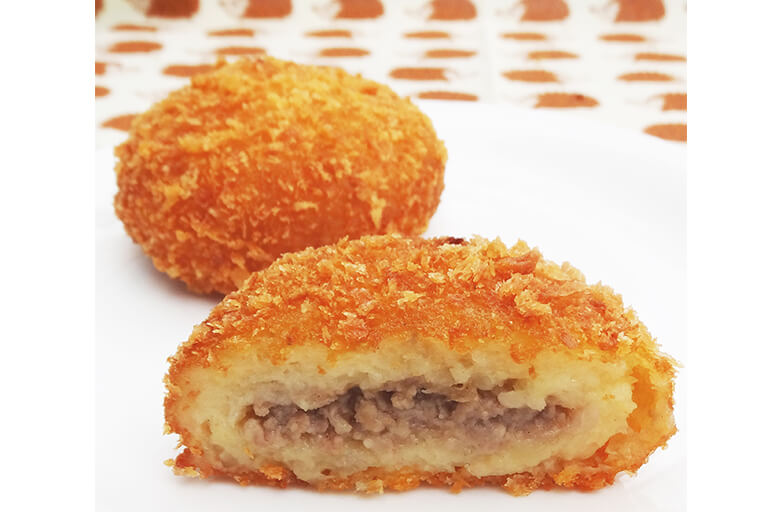 定番の人気商品の讃岐肉まんコロッケ。豚ひき肉をじゃがいもで丸く包み込んだサクサク衣。中のじゃがいもはしっとりホクホクとジューシー肉汁の揚げたてコロッケをお楽しみください。